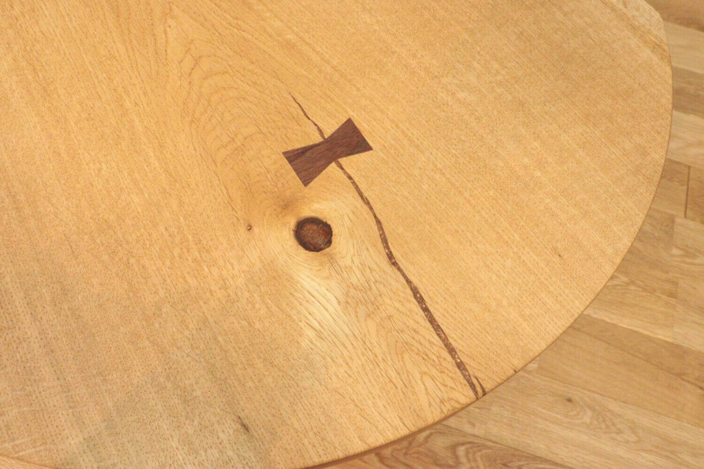 乾燥時に入ったクラックには、アクセントも兼ねたウォールナットのチギリ(割れ止め)を使用する事で一段と引き締まった仕上がりになりました。