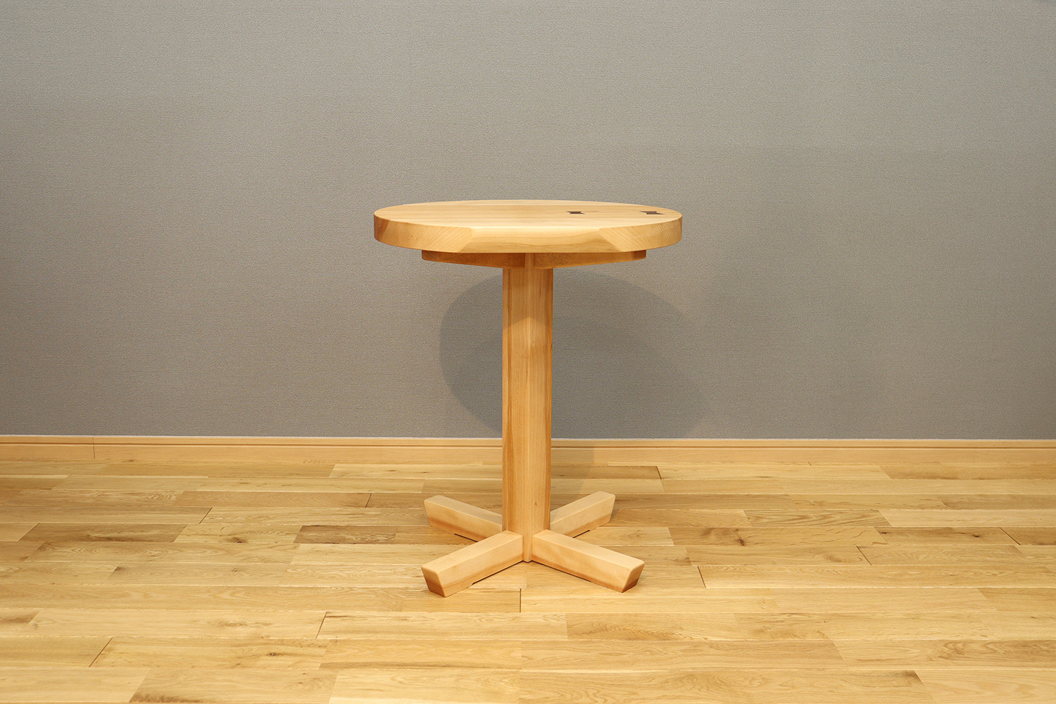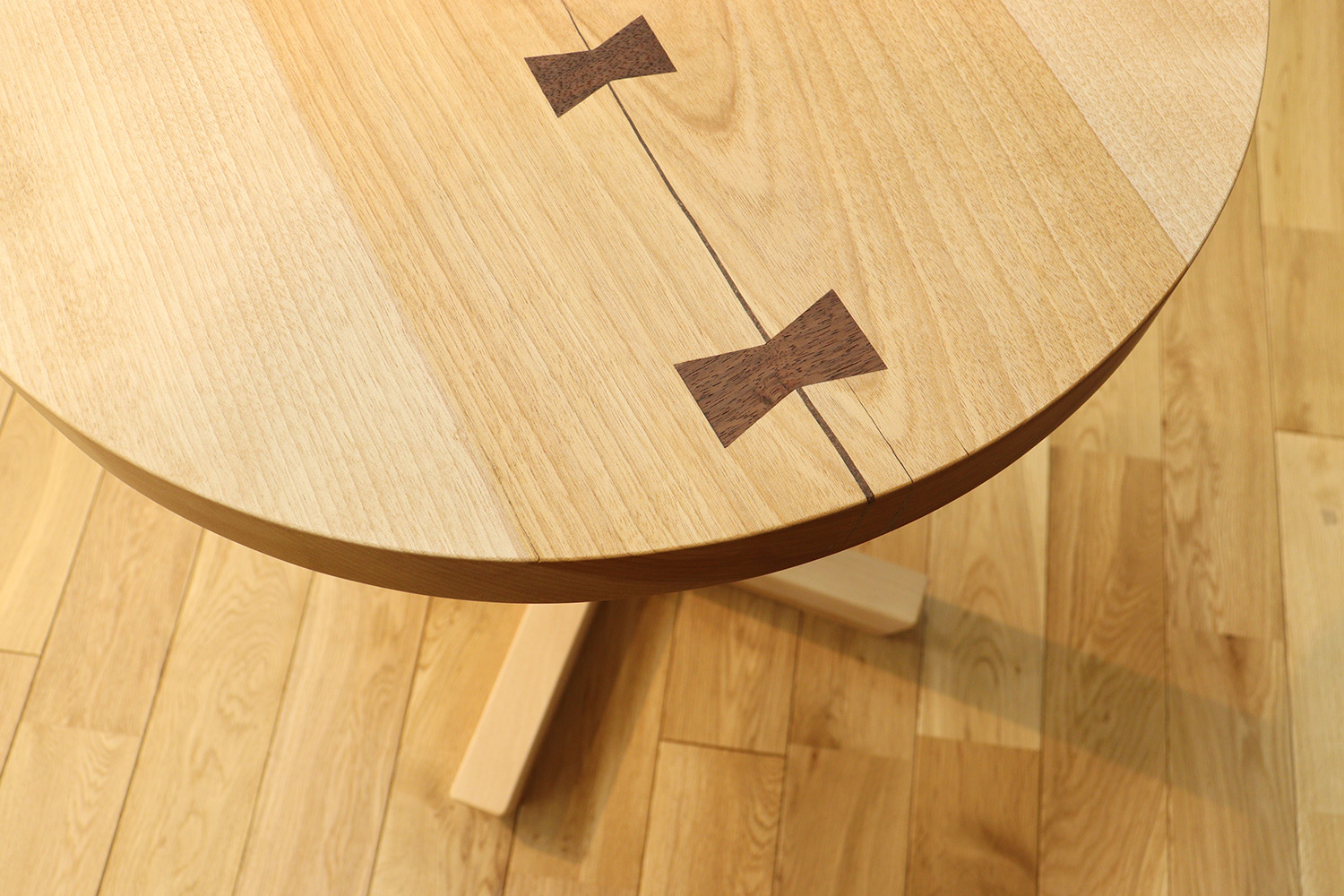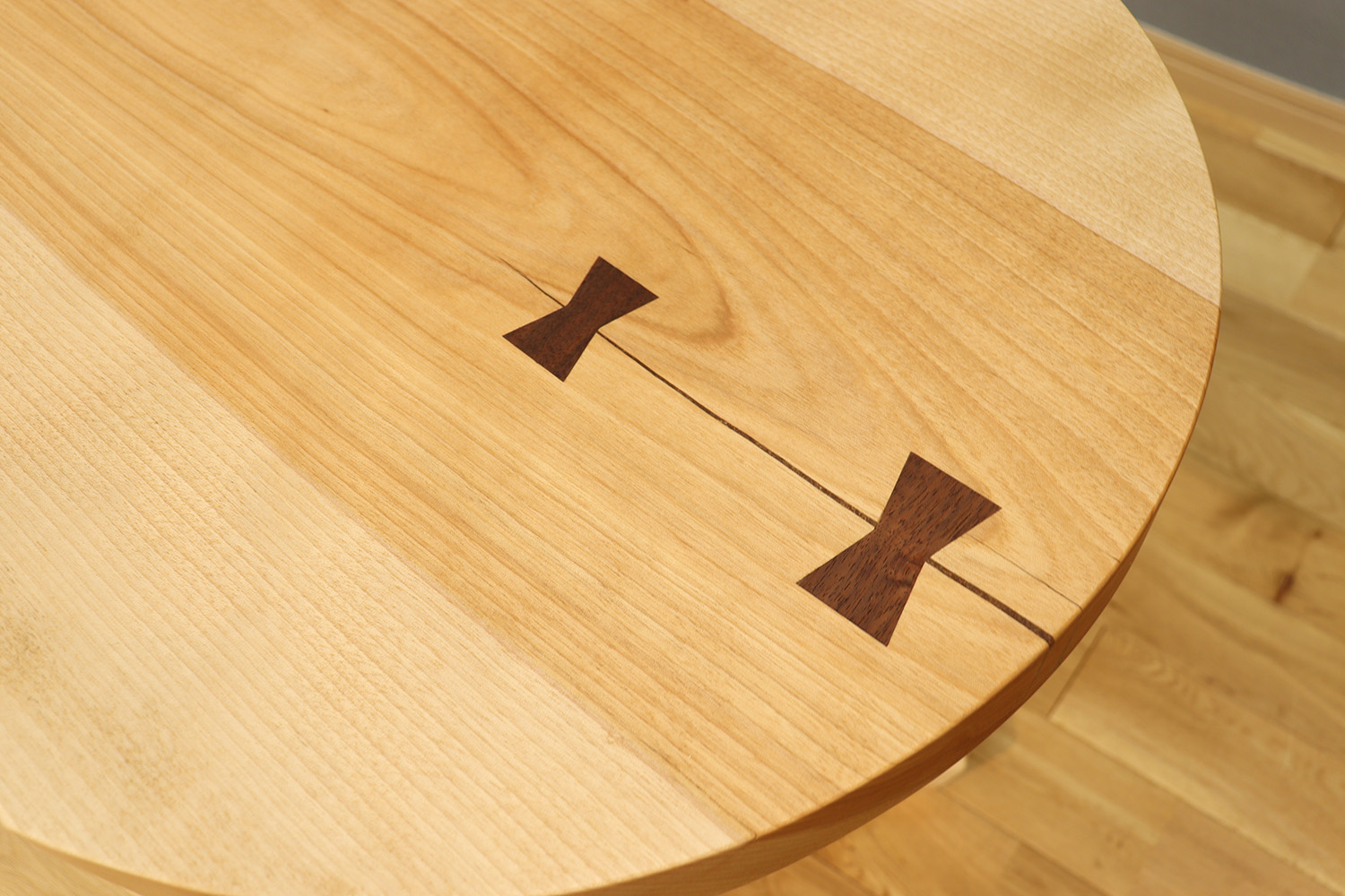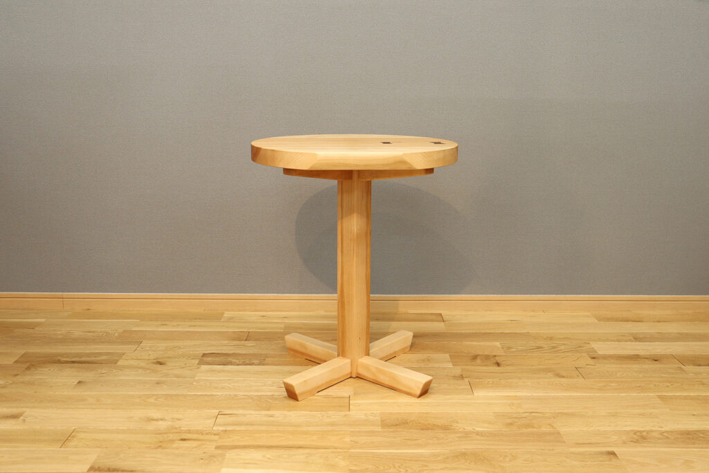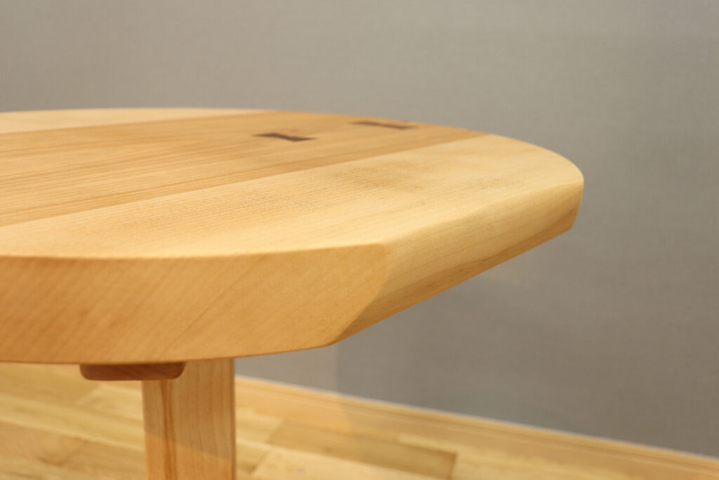 今回仕上がったカバ桜のkomaruは、中央にまっすぐ走る淡い赤身と、割れ止めとして入ったウォールナットのチギリがアクセントとなり、シンプルな形ながらも無垢ならではの印象的な仕上がりとなりました。